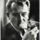 Vor dem Bürgerhaus Gallus in Frankfurt am Main, wo er als Beobachter den Auschwitz-Prozess besucht Rückseitenbeschriftung von anderer Hand: „Arthur Miller und Inge Morath, April 1964“
