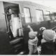 Eine Gruppe Kindergartenkinder trifft auf dem Bahnhof auf abreisende Gastarbeiter