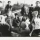 Eine Gruppe Kindergartenkinder trifft auf dem Bahnhof auf abreisende Gastarbeiter