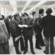 Eine lesende Nonne und andere Buchmesse-Besucher am Stand des Suhrkamp-Verlages Rückseitenbeschriftung von anderer Hand: „Ffm Buchmesse“