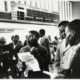 Wartende Männer auf der Straße gegenüber eines Wettbüros in Salisbury, Rhodesien (heute Simbabwe)