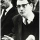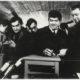 In der Mitte Hans Noever, links daneben Walter Höllerer Rückseitenbeschriftung von Hand der Fotografin: „Zuhörer Höllerer und Növer bei der Lesung in der U-Bahn-Baustelle (Literaturforum)“